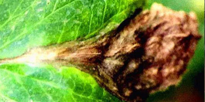 When the stem is infected, it begins as a small water-soaked spot, and then expands into an oblong or irregular shape, light brown. When humidity is high, there is a gray mold layer on the surface of the spot, and in serious cases, the stem and leaves above the disease part die